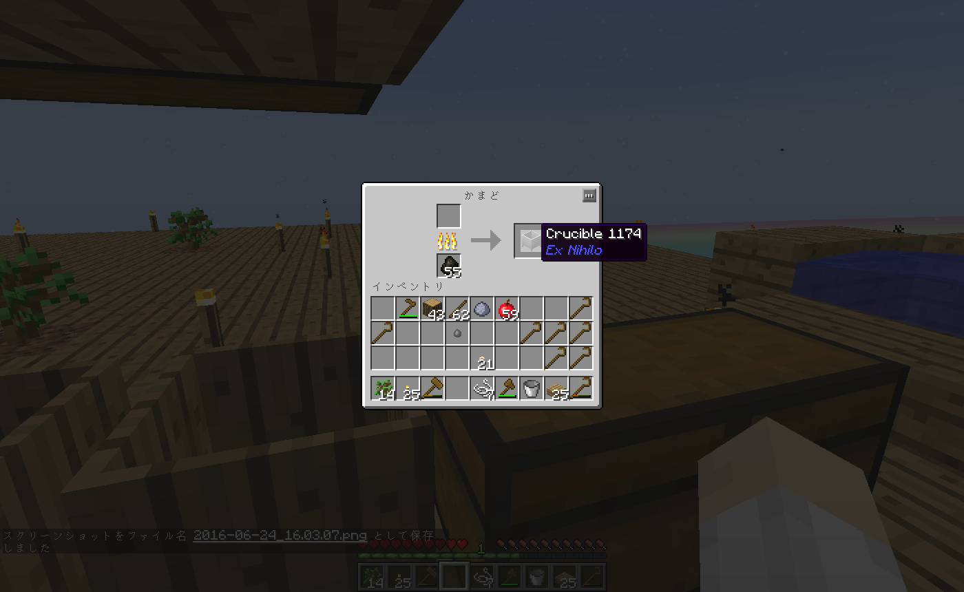 丸石製造機作成に必要な溶岩を作成に必要な粘土製のバレル「Crucible」を作成します。